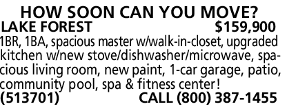 LAKE FOREST $159,900 1BR, 1BA, spacious master w/walk-in-closet, upgraded kitchen w/new stove/dishwasher/microwave, spacious living room, new paint, 1-car garage, patio, community pool, spa & fitness center! (513701) CALL (800) 387-1455