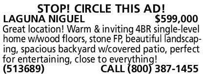 LAGUNA NIGUEL $599,000 Great location! Warm & inviting 4BR single-level home w/wood floors, stone FP, beautiful landscaping, spacious backyard w/covered patio, perfect for entertaining, close to everything! (513689) CALL (800) 387-1455