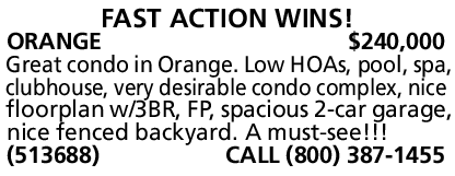 ORANGE $240,000 Great condo in Orange. Low HOAs, pool, spa, clubhouse, very desirable condo complex, nice floorplan w/3BR, FP, spacious 2-car garage, nice fenced backyard. A must-see!!! (513688) CALL (800) 387-1455