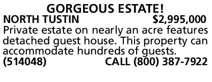 NORTH TUSTIN $2,995,000 Private estate on nearly an acre features detached guest house. This property can accommodate hundreds of guests. (514048) CALL (800) 387-7922
