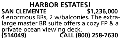 SAN CLEMENTE $1,236,000 4 enormous BRs, 2 w/balconies. The extralarge master BR suite offers a cozy FP & a private ocean viewing deck. (514049) CALL (800) 258-7630
