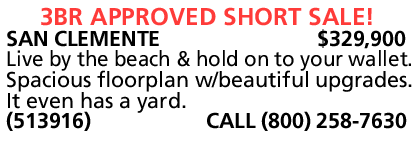 SAN CLEMENTE $329,900 Live by the beach & hold on to your wallet. Spacious floorplan w/beautiful upgrades. It even has a yard. (513916) CALL (800) 258-7630