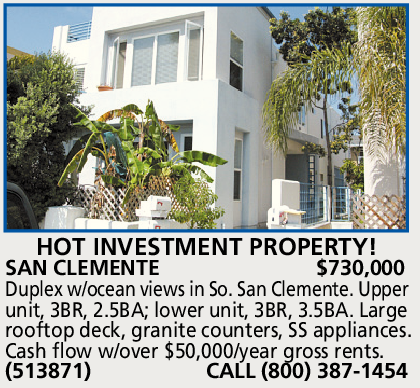 HOT INVESTMENT PROPERTY! SAN CLEMENTE $730,000 Duplex w/ocean views in So. San Clemente. Upper unit, 3BR, 2.5BA; lower unit, 3BR, 3.5BA. Large rooftop deck, granite counters, SS appliances. Cash flow w/over $50,000/year gross rents. (513871) CALL (800) 387-1454