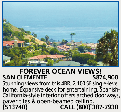 FOREVER OCEAN VIEWS! SAN CLEMENTE $874,900 Stunning views from this 4BR, 2,100 SF single-level home. Expansive deck for entertaining. Spanish- California-style interior offers arched doorways, paver tiles & open-beamed ceiling. (513740) CALL (800) 387-7930