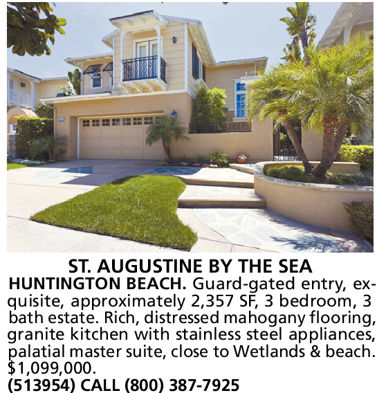 ST. AUGUSTINE BY THE SEA HUNTINGTON BEACH. Guard-gated entry, exquisite, approximately 2,357 SF, 3 bedroom, 3 bath estate. Rich, distressed mahogany flooring, granite kitchen with stainless steel appliances, palatial master suite, close to Wetlands & beach. $1,099,000. (513954) CALL (800) 387-7925