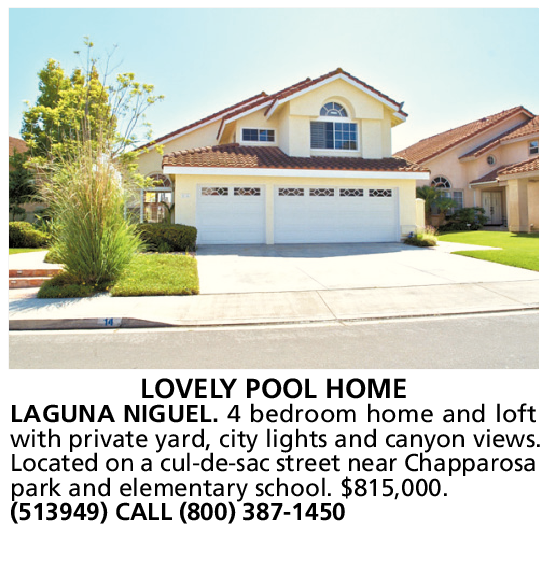 LOVELY POOL HOME LAGUNA NIGUEL. 4 bedroom home and loft with private yard, city lights and canyon views. Located on a cul-de-sac street near Chapparosa park and elementary school. $815,000. (513949) CALL (800) 387-1450