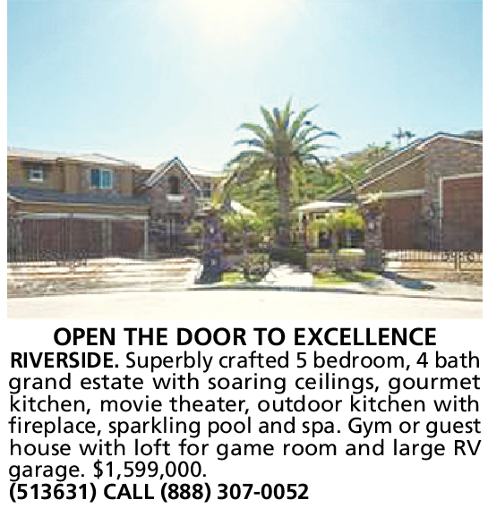 OPEN THE DOOR TO EXCELLENCE RIVERSIDE. Superbly crafted 5 bedroom, 4 bath grand estate with soaring ceilings, gourmet kitchen, movie theater, outdoor kitchen with fireplace, sparkling pool and spa. Gym or guest house with loft for game room and large RV garage. $1,599,000. (513631) CALL (888) 307-0052