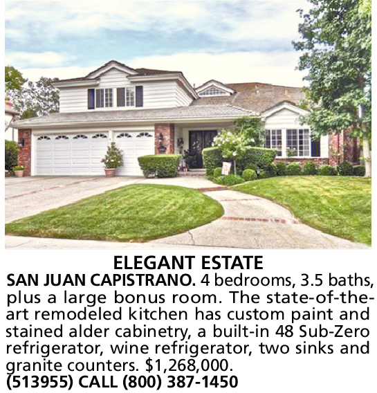 ELEGANT ESTATE SAN JUAN CAPISTRANO. 4 bedrooms, 3.5 baths, plus a large bonus room. The state-of-theart remodeled kitchen has custom paint and stained alder cabinetry, a built-in 48 Sub-Zero refrigerator, wine refrigerator, two sinks and granite counters. $1,268,000. (513955) CALL (800) 387-1450