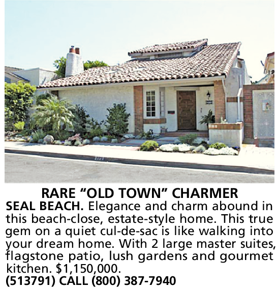 RARE “OLD TOWN” CHARMER SEAL BEACH. Elegance and charm abound in this beach-close, estate-style home. This true gem on a quiet cul-de-sac is like walking into your dream home. With 2 large master suites, flagstone patio, lush gardens and gourmet kitchen. $1,150,000. (513791) CALL (800) 387-7940