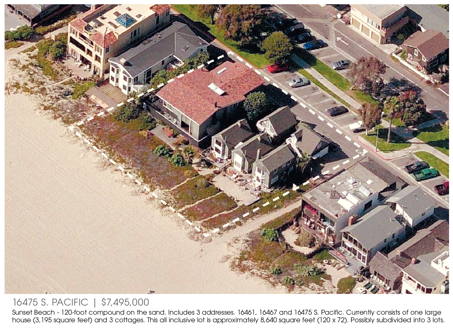 16475 S. PACIFIC | $7,495,000 Sunset Beach - 120-foot compound on the sand. Includes 3 addresses. 16461, 16467 and 16475 S. Pacific. Currently consists of one large house (3,195 square feet) and 3 cottages. This all inclusive lot is approximately 8,640 square feet (120 x 72). Possibly subdivided into 3 lots.