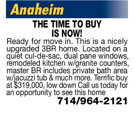 Anaheim THE TIME TO BUY IS NOW! Ready for move in. This is a nicely upgraded 3BR home. Located on a quiet cul-de-sac, dual pane windows, remodeled kitchen w/granite counters, master BR includes private bath area w/jacuzzi tub & much more. Terrific buy at $319,000, low down Call us today for an opportunity to see this home 714/964-2121