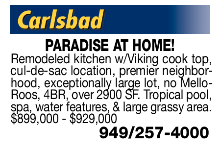 Carlsbad PARADISE AT HOME! Remodeled kitchen w/Viking cook top, cul-de-sac location, premier neighborhood, exceptionally large lot, no Mello- Roos, 4BR, over 2900 SF. Tropical pool, spa, water features, & large grassy area. $899,000 - $929,000 949/257-4000