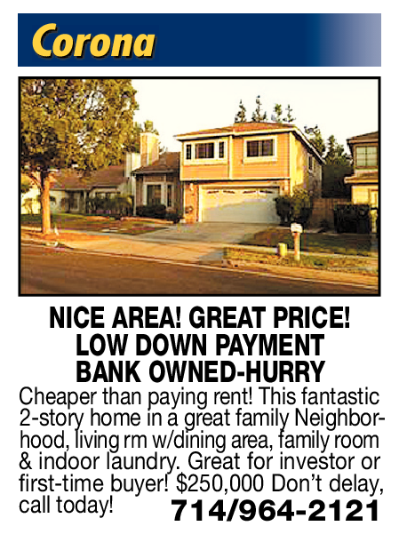Corona NICE AREA! GREAT PRICE! LOW DOWN PAYMENT BANK OWNED-HURRY Cheaper than paying rent! This fantastic 2-story home in a great family Neighborhood, living rm w/dining area, family room & indoor laundry. Great for investor or first-time buyer! $250,000 Don’t delay, call today! 714/964-2121