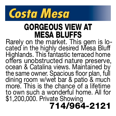 GORGEOUS VIEW AT MESA BLUFFS Rarely on the market. This gem is located in the highly desired Mesa Bluff Highlands. This fantastic terraced home offers unobstructed nature preserve, ocean & Catalina views. Maintained by the same owner. Spacious floor plan, full dining room w/wet bar & patio & much more. This is the chance of a lifetime to own such a wonderful home. All for $1,200,000. Private Showing 714/964-2121