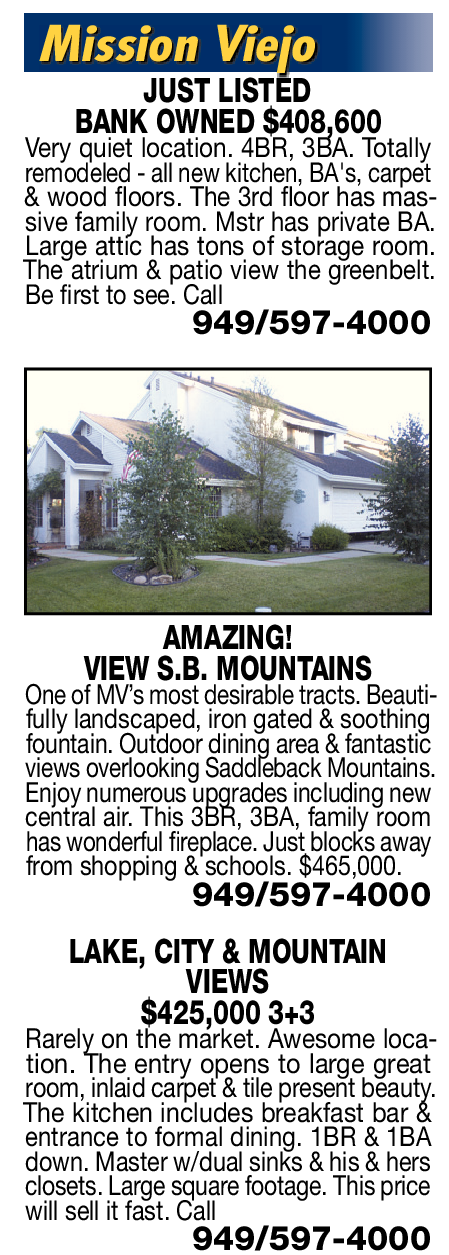 LAKE, CITY & MOUNTAIN VIEWS $425,000 3+3 Rarely on the market. Awesome location. The entry opens to large great room, inlaid carpet & tile present beauty. The kitchen includes breakfast bar & entrance to formal dining. 1BR & 1BA down. Master w/dual sinks & his & hers closets. Large square footage. This price will sell it fast. Call 949/597-4000 Mission Viejo JUST LISTED BANK OWNED $408,600 Very quiet location. 4BR, 3BA. Totally remodeled - all new kitchen, BA's, carpet & wood floors. The 3rd floor has massive family room. Mstr has private BA. Large attic has tons of storage room. The atrium & patio view the greenbelt. Be first to see. Call 949/597-4000 AMAZING! VIEW S.B. MOUNTAINS One of MV’s most desirable tracts. Beautifully landscaped, iron gated & soothing fountain. Outdoor dining area & fantastic views overlooking Saddleback Mountains. Enjoy numerous upgrades including new central air. This 3BR, 3BA, family room has wonderful fireplace. Just blocks away from shopping & schools. $465,000. 949/597-4000 See also