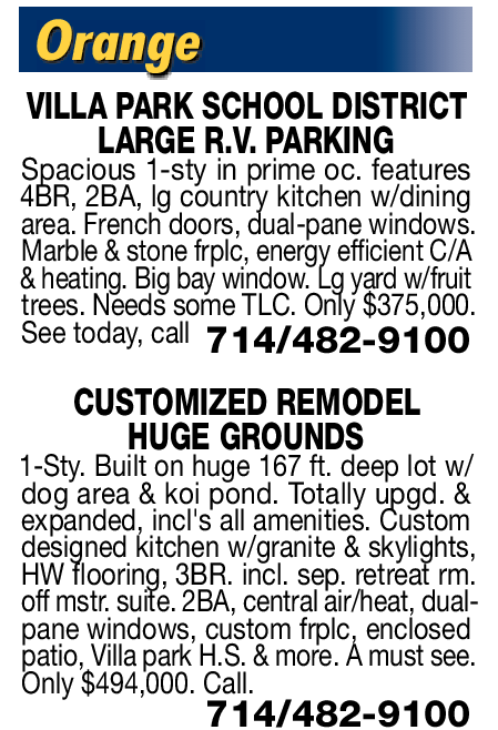 Orange VILLA PARK SCHOOL DISTRICT LARGE R.V. PARKING Spacious 1-sty in prime oc. features 4BR, 2BA, lg country kitchen w/dining area. French doors, dual-pane windows. Marble & stone frplc, energy efficient C/A & heating. Big bay window. Lg yard w/fruit trees. Needs some TLC. Only $375,000. See today, call 714/482-9100 CUSTOMIZED REMODEL HUGE GROUNDS 1-Sty. Built on huge 167 ft. deep lot w/ dog area & koi pond. Totally upgd. & expanded, incl's all amenities. Custom designed kitchen w/granite & skylights, HW flooring, 3BR. incl. sep. retreat rm. off mstr. suite. 2BA, central air/heat, dualpane windows, custom frplc, enclosed patio, Villa park H.S. & more. A must see. Only $494,000. Call. 714/482-9100