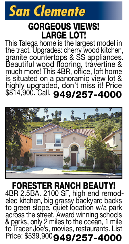 FORESTER RANCH BEAUTY! 4BR 2.5BA. 2100 SF, high end remodeled kitchen, big grassy backyard backs to green slope, quiet location w/a park across the street. Award winning schools & parks, only 2 miles to the ocean, 1 mile to Trader Joe’s, movies, restaurants. List Price: $539,900 949/257-4000 San Clemente GORGEOUS VIEWS! LARGE LOT! This Talega home is the largest model in the tract. Upgrades: cherry wood kitchen, granite countertops & SS appliances. Beautiful wood flooring, travertine & much more! This 4BR, office, loft home is situated on a panoramic view lot & highly upgraded, don’t miss it! Price $814,900. Call. 949/257-4000