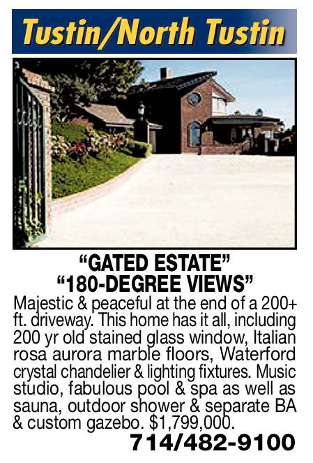 Tustin/North Tustin “GATED ESTATE” “180-DEGREE VIEWS” Majestic & peaceful at the end of a 200+ ft. driveway. This home has it all, including 200 yr old stained glass window, Italian rosa aurora marble floors, Waterford crystal chandelier & lighting fixtures. Music studio, fabulous pool & spa as well as sauna, outdoor shower & separate BA & custom gazebo. $1,799,000. 714/482-9100
