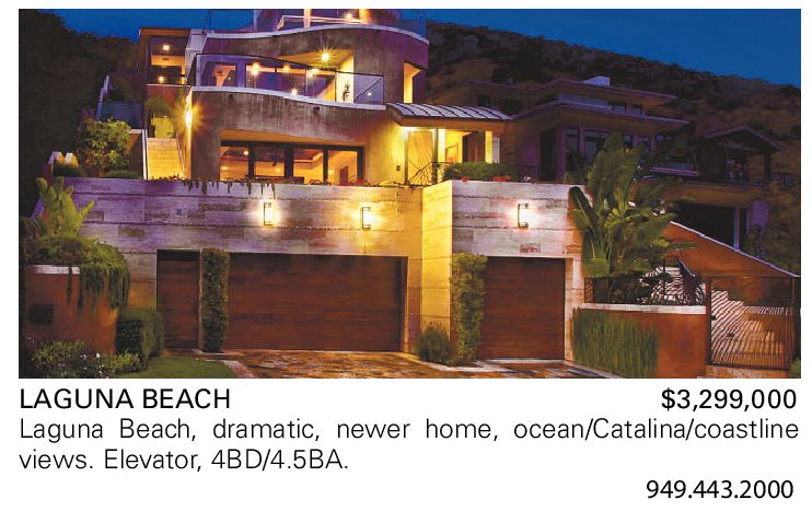 LAGUNA BEACH $3,299,000 Laguna Beach, dramatic, newer home, ocean/Catalina/coastline views. Elevator, 4BD/4.5BA.