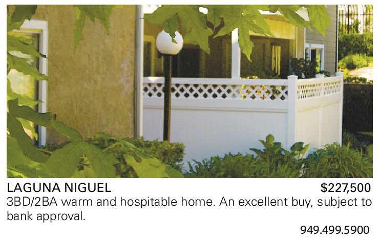LAGUNA NIGUEL $227,500 3BD/2BA warm and hospitable home. An excellent buy, subject to bank approval.
