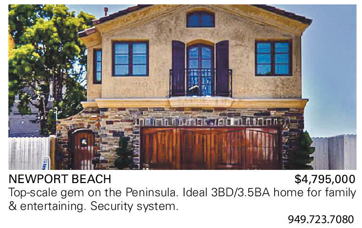 NEWPORT BEACH $4,795,000 Top-scale gem on the Peninsula. Ideal 3BD/3.5BA home for family & entertaining. Security system.
