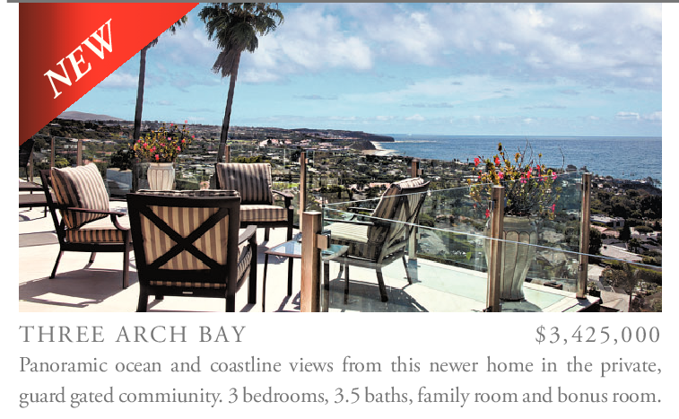 THREE ARCH BAY $3,425,000 Panoramic ocean and coastline views from this newer home in the private, guard gated commiunity. 3 bedrooms, 3.5 baths, family room and bonus room.