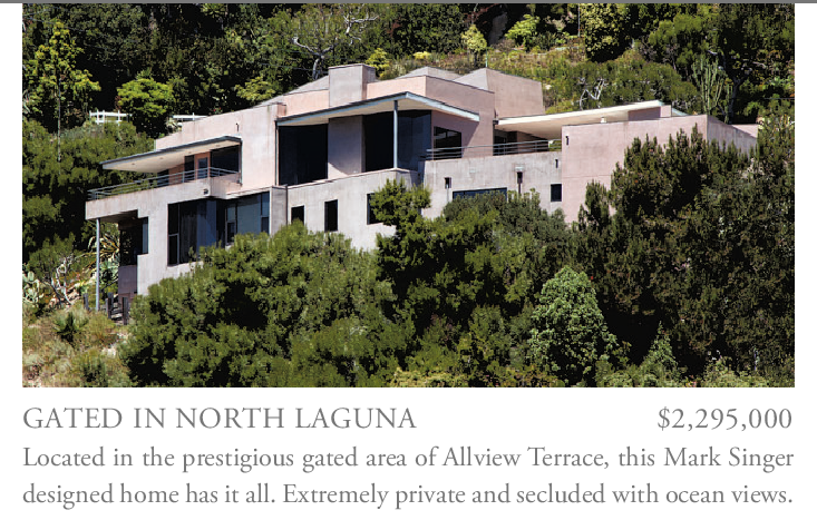 GATED IN NORTH LAGUNA $2,295,000 Located in the prestigious gated area of Allview Terrace, this Mark Singer designed home has it all. Extremely private and secluded with ocean views.