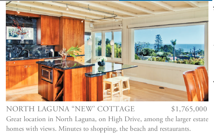 NORTH LAGUNA “NEW’ COTTAGE $1,765,000 Great location in North Laguna, on High Drive, among the larger estate homes with views. Minutes to shopping, the beach and restaurants.