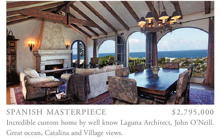 SPANISH MASTERPIECE $2,795,000 Incredible custom home by well know Laguna Architect, John O’Neill. Great ocean, Catalina and Village views.