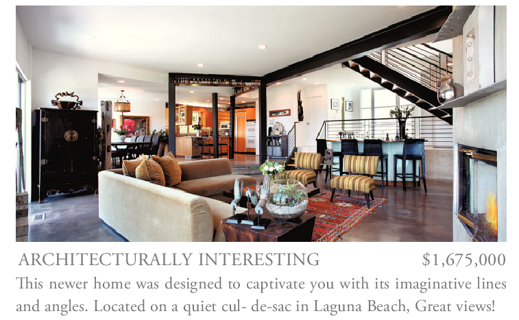 ARCHITECTURALLY INTERESTING $1,675,000 This newer home was designed to captivate you with its imaginative lines and angles. Located on a quiet cul- de-sac in Laguna Beach, Great views!