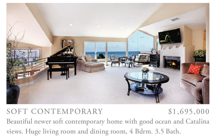 SOFT CONTEMPORARY $1,695,000 Beautiful newer soft contemporary home with good ocean and Catalina views. Huge living room and dining room, 4 Bdrm. 3.5 Bath.