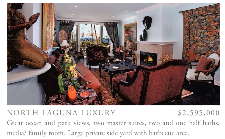 NORTH LAGUNA LUXURY $2,595,000 Great ocean and park views, two master suites, two and one half baths, media/ family room. Large private side yard with barbecue area.