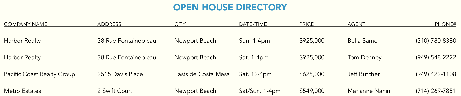 Harbor Realty 38 Rue Fontainebleau Newport Beach Sat. 1-4pm $925,000 Tom Denney (949) 548-2222