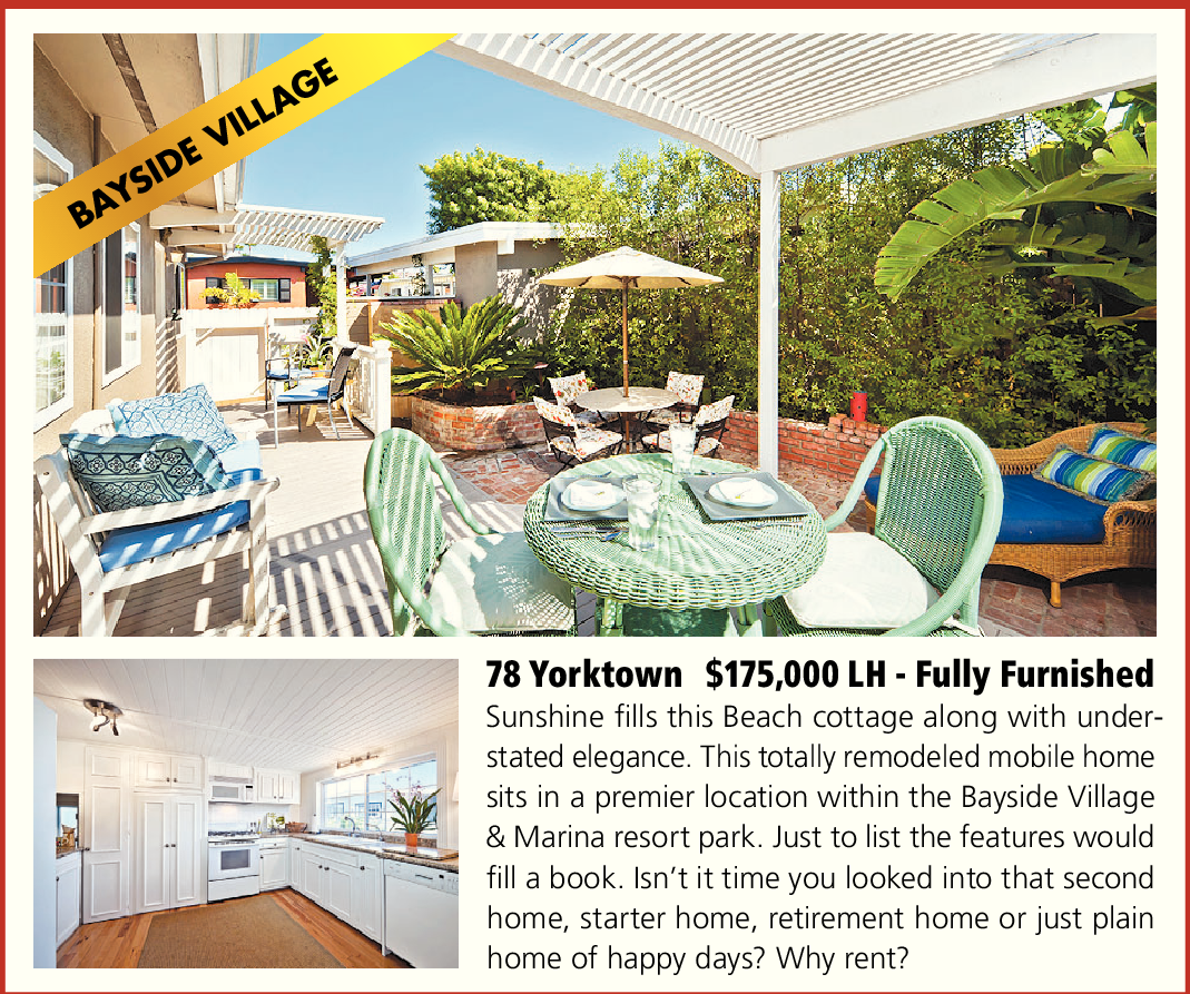 78 Yorktown $175,000 LH - Fully Furnished Sunshine fills this Beach cottage along with understated elegance. This totally remodeled mobile home sits in a premier location within the Bayside Village & Marina resort park. Just to list the features would fill a book. Isn’t it time you looked into that second home, starter home, retirement home or just plain home of happy days? Why rent?