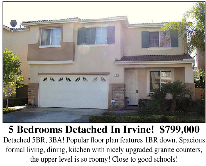 5 Bedrooms Detached In Irvine! $799,000 Detached 5BR, 3BA! Popular floor plan features 1BR down. Spacious formal living, dining, kitchen with nicely upgraded granite counters, the upper level is so roomy! Close to good schools!