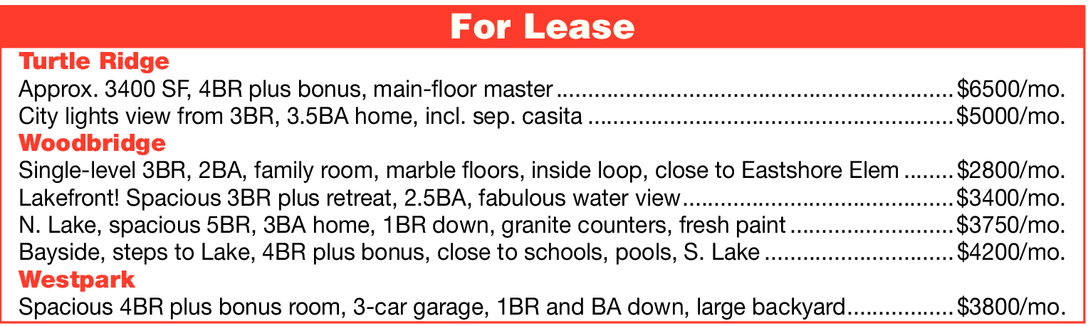Turtle Ridge Approx. 3400 SF, 4BR plus bonus, main-floor master ...............................................................$6500/mo. City lights view from 3BR, 3.5BA home, incl. sep. casita ..........................................................$5000/mo. Woodbridge Single-level 3BR, 2BA, family room, marble floors, inside loop, close to Eastshore Elem ........$2800/mo. Lakefront! Spacious 3BR plus retreat, 2.5BA, fabulous water view ...........................................$3400/mo. N. Lake, spacious 5BR, 3BA home, 1BR down, granite counters, fresh paint ..........................$3750/mo. Bayside, steps to Lake, 4BR plus bonus, close to schools, pools, S. Lake ..............................$4200/mo. Westpark Spacious 4BR plus bonus room, 3-car garage, 1BR and BA down, large backyard .................$3800/mo.