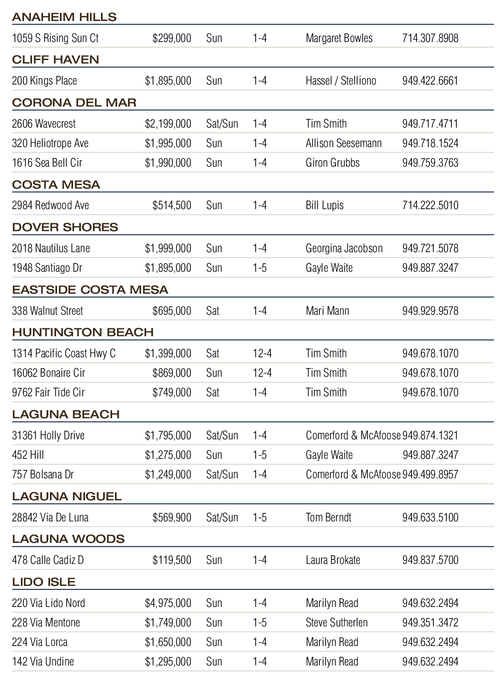 2606 Wavecrest $2,199,000 Sat/Sun 1-4 Tim Smith 949.717.4711 320 Heliotrope Ave $1,995,000 Sun 1-4 Allison Seesemann 949.718.1524 1616 Sea Bell Cir $1,990,000 Sun 1-4 Giron Grubbs 949.759.3763 COSTA MESA 2984 Redwood Ave $514,500 Sun 1-4 Bill Lupis 714.222.5010 DOVER SHORES 2018 Nautilus Lane $1,999,000 Sun 1-4 Georgina Jacobson 949.721.5078 1948 Santiago Dr $1,895,000 Sun 1-5 Gayle Waite 949.887.3247 EASTSIDE COSTA MESA 338 Walnut Street $695,000 Sat 1-4 Mari Mann 949.929.9578 HUNTINGTON BEACH 1314 Pacific Coast Hwy C $1,399,000 Sat 12-4 Tim Smith 949.678.1070 16062 Bonaire Cir $869,000 Sun 12-4 Tim Smith 949.678.1070 9762 Fair Tide Cir $749,000 Sat 1-4 Tim Smith 949.678.1070 LAGUNA BEACH 31361 Holly Drive $1,795,000 Sat/Sun 1-4 Comerford & McAfoose 949.874.1321 452 Hill $1,275,000 Sun 1-5 Gayle Waite 949.887.3247 757 Bolsana Dr $1,249,000 Sat/Sun 1-4 Comerford & McAfoose 949.499.8957 LAGUNA NIGUEL 28842 Via De Luna $569,900 Sat/Sun 1-5 Tom Berndt 949.633.5100 LAGUNA WOODS 478 Calle Cadiz D $119,500 Sun 1-4 Laura Brokate 949.837.5700 LIDO ISLE 220 Via Lido Nord $4,975,000 Sun 1-4 Marilyn Read 949.632.2494 228 Via Mentone $1,749,000 Sun 1-5 Steve Sutherlen 949.351.3472 224 Via Lorca $1,650,000 Sun 1-4 Marilyn Read 949.632.2494 142 Via Undine $1,295,000 Sun 1-4 Marilyn Read 949.632.2494