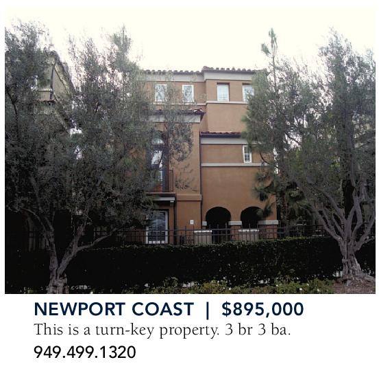 NEWPORT COAST | $895,000 This is a turn-key property. 3 br 3 ba. 949.499.1320