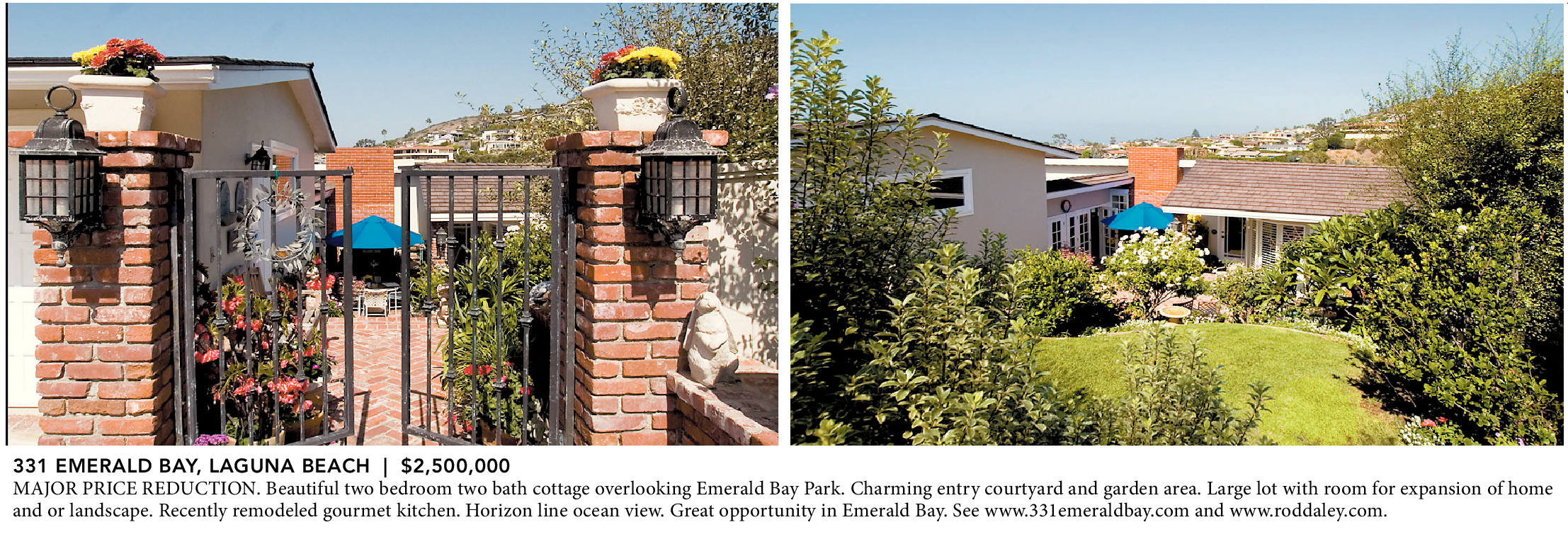 331 EMERALD BAY, LAGUNA BEACH | $2,500,000 MAJOR PRICE REDUCTION. Beautiful two bedroom two bath cottage overlooking Emerald Bay Park. Charming entry courtyard and garden area. Large lot with room for expansion of home and or landscape. Recently remodeled gourmet kitchen. Horizon line ocean view. Great opportunity in Emerald Bay. See www.331emeraldbay.com and www.roddaley.com.