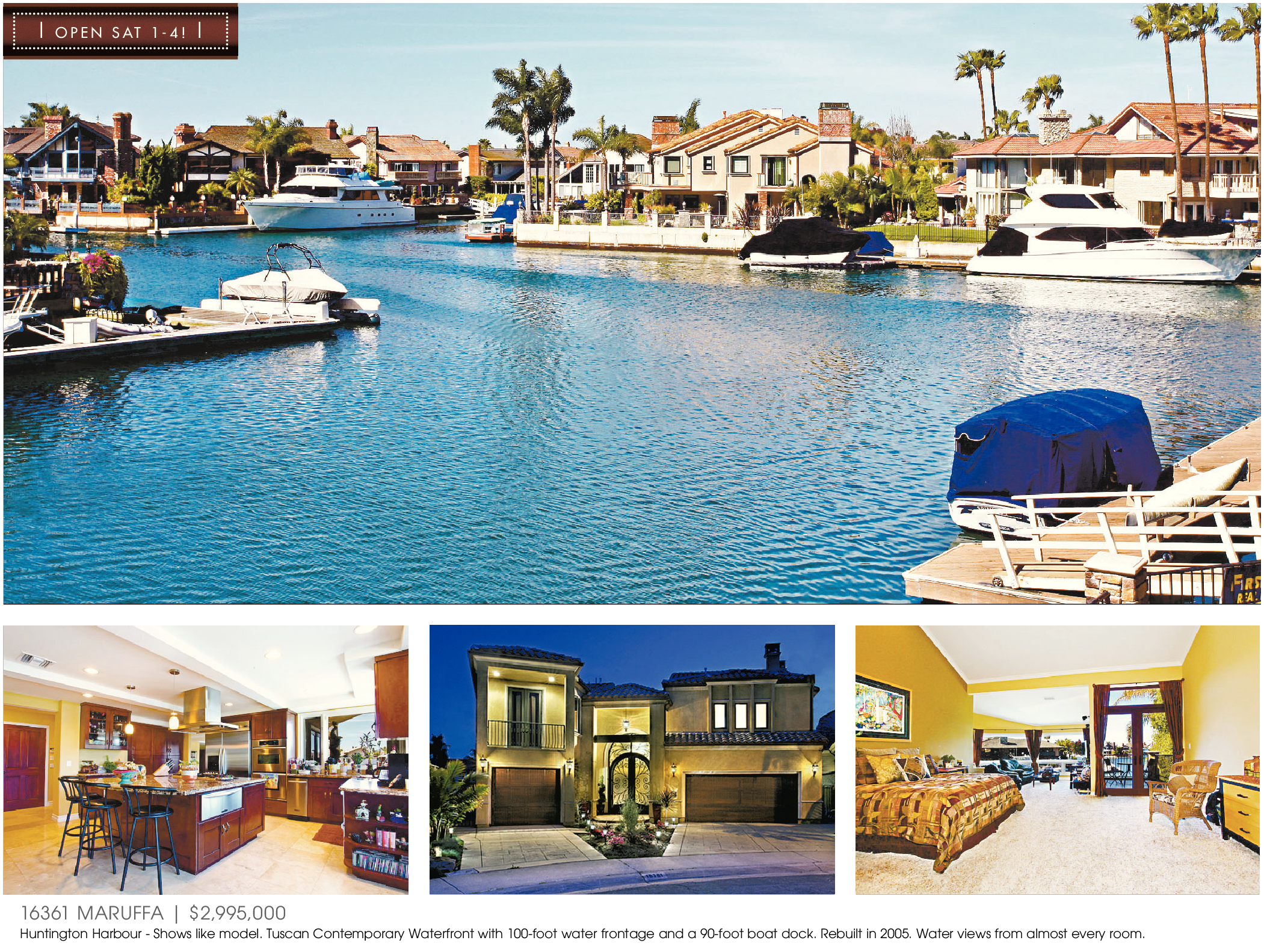 16361 MARUFFA | $2,995,000 Huntington Harbour - Shows like model. Tuscan Contemporary Waterfront with 100-foot water frontage and a 90-foot boat dock. Rebuilt in 2005. Water views from almost every room.