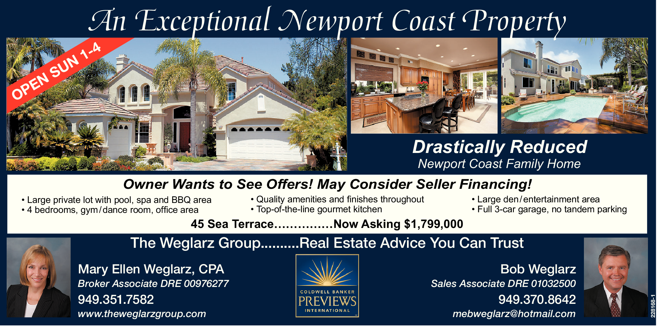 An Exceptional Newport Coast Property • Large private lot with pool, spa and BBQ area • 4 bedrooms, gym / dance room, office area Mary Ellen Weglarz, CPA Broker Associate DRE 00976277 949.351.7582 www.theweglarzgroup.com Drastically Reduced Newport Coast Family Home Owner Wants to See Offers! May Consider Seller Financing! • Quality amenities and finishes throughout • Top-of-the-line gourmet kitchen 45 Sea Terrace……………Now Asking $1,799,000 The Weglarz Group..........Real Estate Advice You Can Trust • Large den / entertainment area • Full 3-car garage, no tandem parking Bob Weglarz Sales Associate DRE 01032500 949.370.8642 mebweglarz@hotmail.com