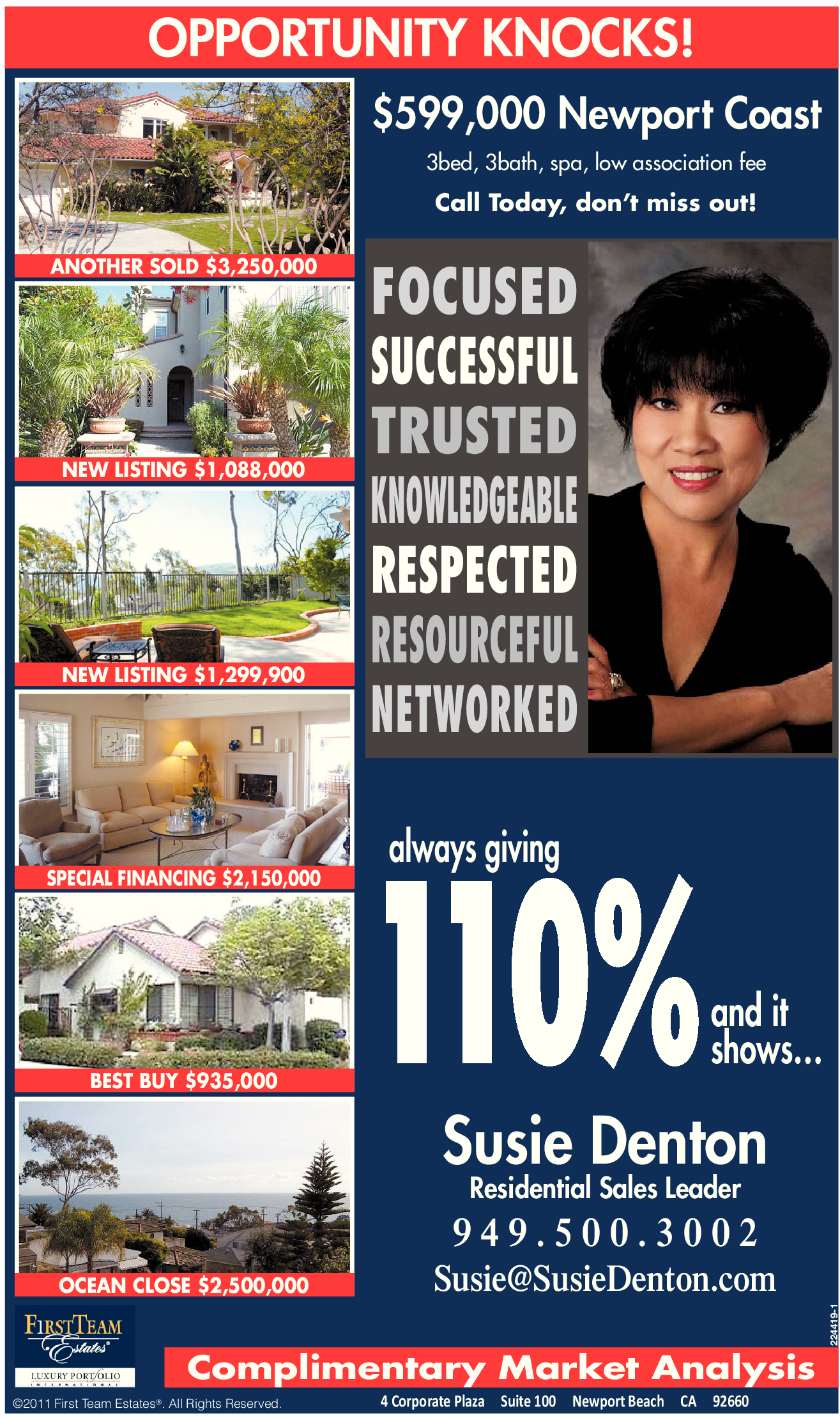 OPPORTUNITY KNOCKS! ANOTHER SOLD $3,250,000 NEW LISTING $1,088,000 NEW LISTING $1,299,900 SPECIAL FINANCING $2,150,000 BEST BUY $935,000 OCEAN CLOSE $2,500,000 ©2011 First Team Estates ® . All Rights Reserved. $599,000 Newport Coast 3bed, 3bath, spa, low association fee Call Today, don’t miss out! FOCUSED SUCCESSFUL TRUSTED KNOWLEDGEABLE RESPECTED RESOURCEFUL NETWORKED always giving 110% and it shows… Susie Denton Residential Sales Leader 9 4 9 . 5 0 0 . 3 0 0 2 Susie@SusieDenton.com Complimentary Market Analysis 4 Corporate Plaza Suite 100 Newport Beach CA 92660