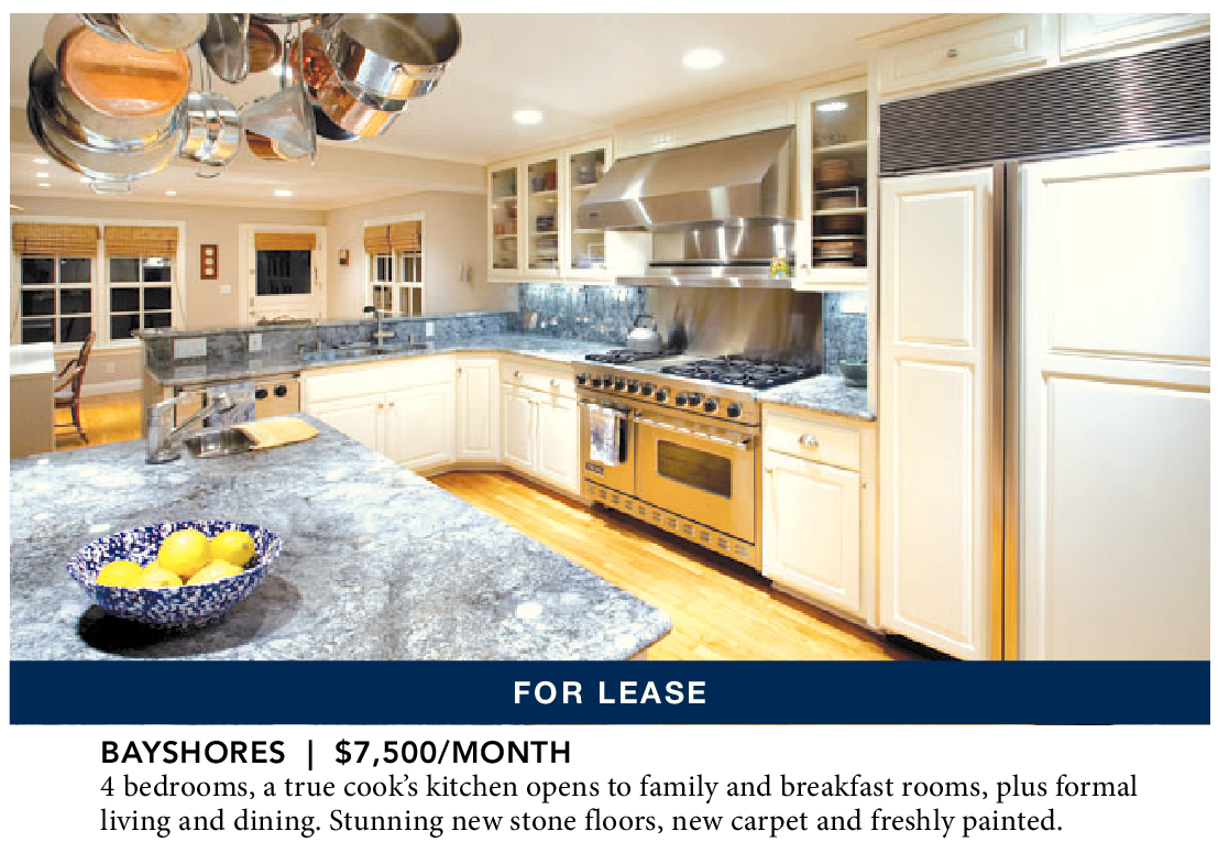 BAYSHORES | $7,500/MONTH 4 bedrooms, a true cook’s kitchen opens to family and breakfast rooms, plus formal living and dining. Stunning new stone floors, new carpet and freshly painted.