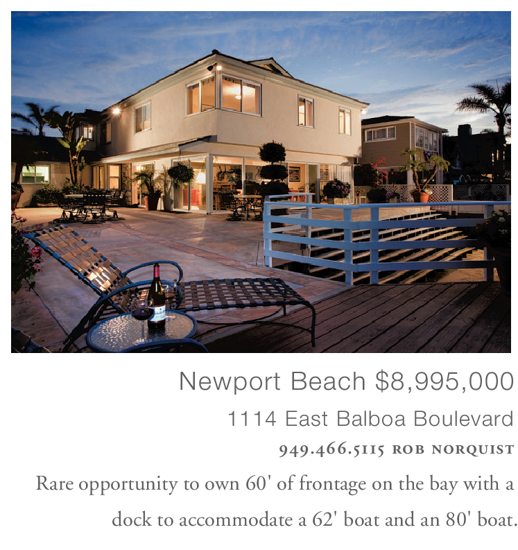 Newport Beach $8,995,000 1114 East Balboa Boulevard 949.466.5115 rob norquist Rare opportunity to own 60' of frontage on the bay with a dock to accommodate a 62' boat and an 80' boat.
