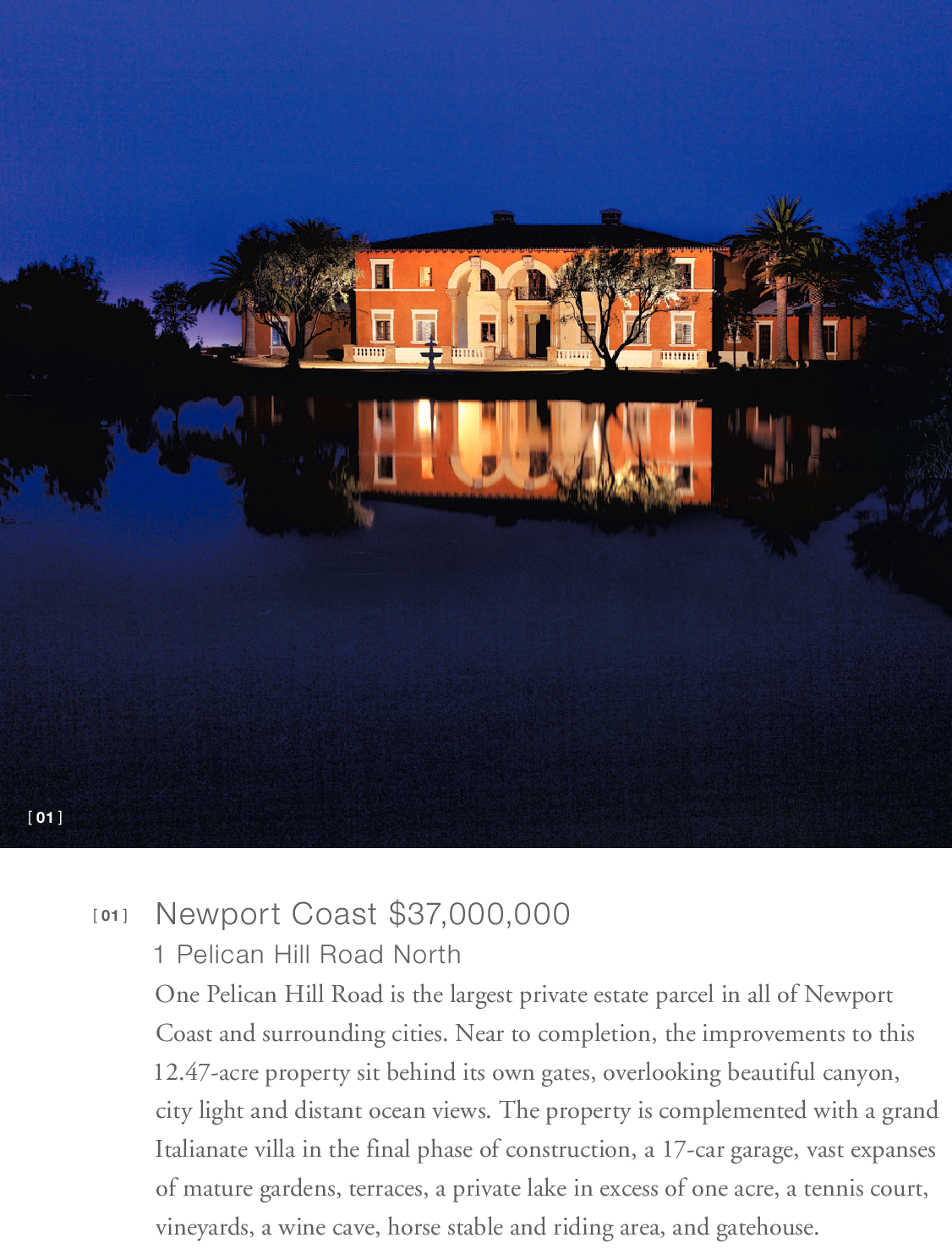 [ 01 ] [ 01 ] Newport Coast $37,000,000 1 Pelican Hill Road North One Pelican Hill Road is the largest private estate parcel in all of Newport Coast and surrounding cities. Near to completion, the improvements to this 12.47-acre property sit behind its own gates, overlooking beautiful canyon, city light and distant ocean views. The property is complemented with a grand Italianate villa in the final phase of construction, a 17-car garage, vast expanses of mature gardens, terraces, a private lake in excess of one acre, a tennis court, vineyards, a wine cave, horse stable and riding area, and gatehouse.