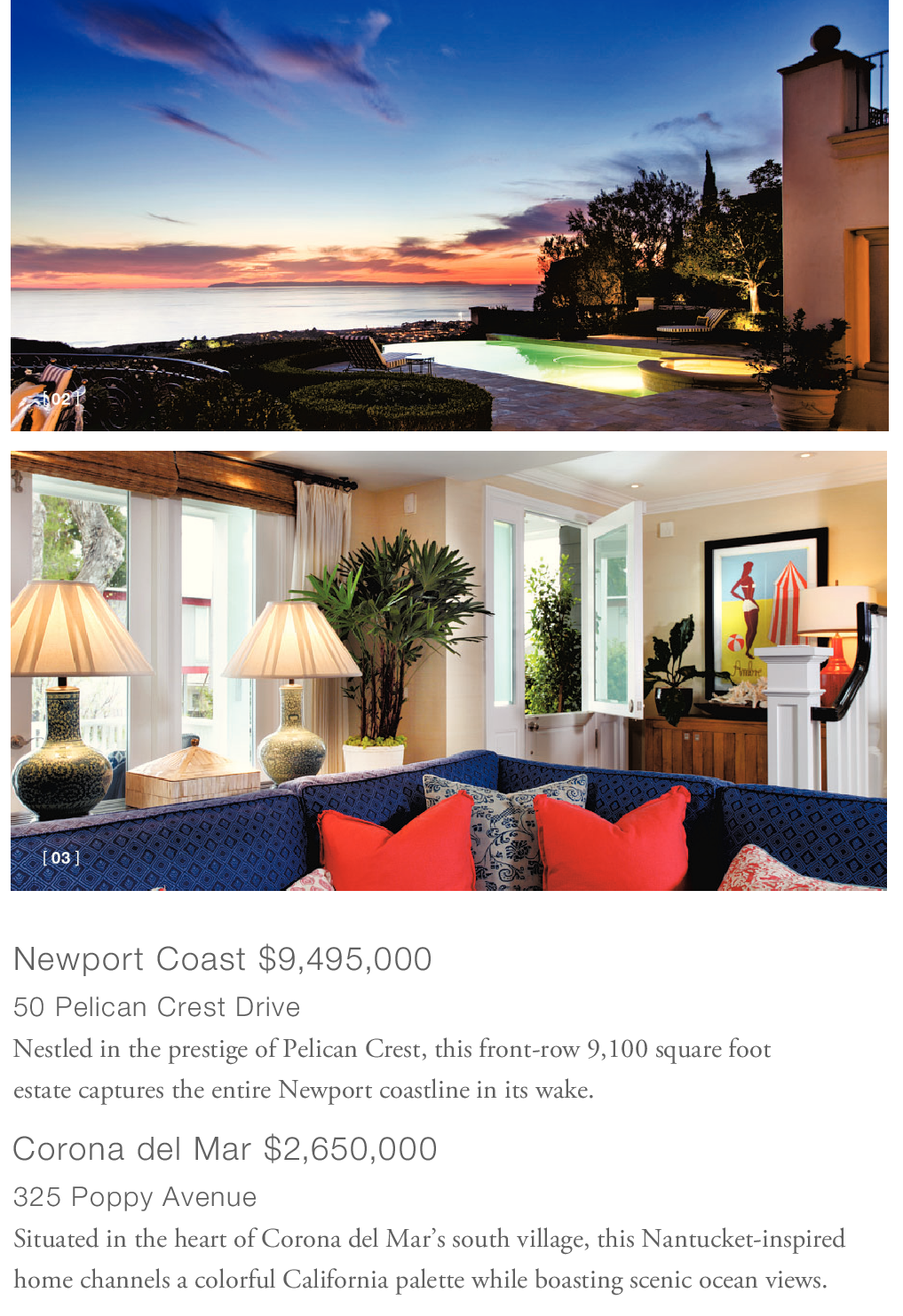 [ 03 ] [ 02 ] Newport Coast $9,495,000 50 Pelican Crest Drive Nestled in the prestige of Pelican Crest, this front-row 9,100 square foot estate captures the entire Newport coastline in its wake. Corona del Mar $2,650,000 325 Poppy Avenue Situated in the heart of Corona del Mar’s south village, this Nantucket-inspired home channels a colorful California palette while boasting scenic ocean views.