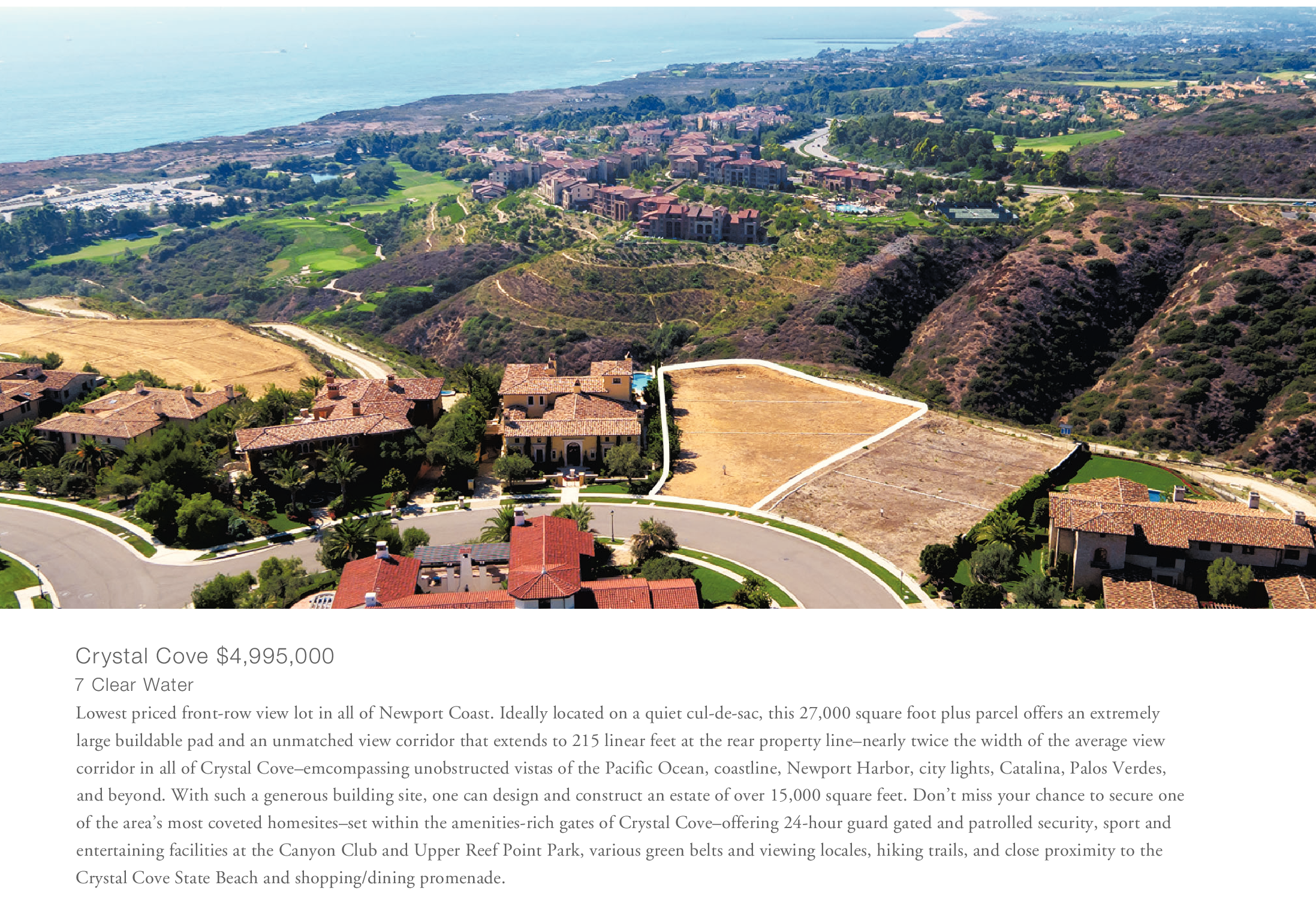 Crystal Cove $4,995,000 7 Clear Water Lowest priced front-row view lot in all of Newport Coast. Ideally located on a quiet cul-de-sac, this 27,000 square foot plus parcel offers an extremely large buildable pad and an unmatched view corridor that extends to 215 linear feet at the rear property line–nearly twice the width of the average view corridor in all of Crystal Cove–emcompassing unobstructed vistas of the Pacific Ocean, coastline, Newport Harbor, city lights, Catalina, Palos Verdes, and beyond. With such a generous building site, one can design and construct an estate of over 15,000 square feet. Don’t miss your chance to secure one of the area’s most coveted homesites–set within the amenities-rich gates of Crystal Cove–offering 24-hour guard gated and patrolled security, sport and entertaining facilities at the Canyon Club and Upper Reef Point Park, various green belts and viewing locales, hiking trails, and close proximity to the Crystal Cove State Beach and shopping/dining promenade.