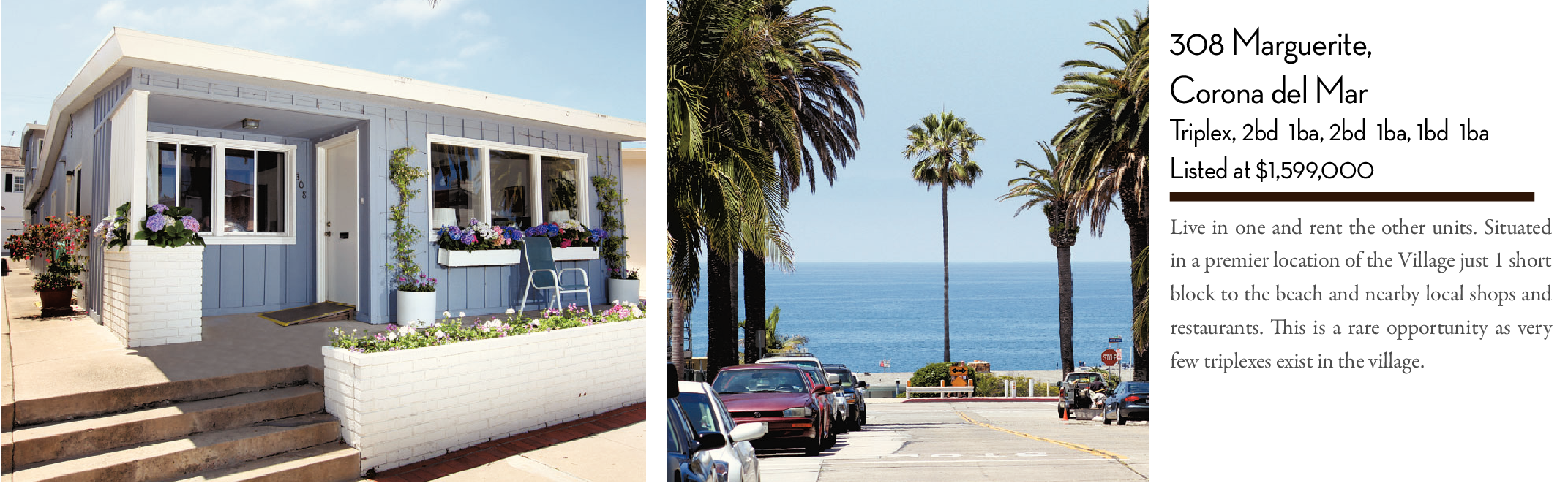 Live in one and rent the other units. Situated in a premier location of the Village just 1 short block to the beach and nearby local shops and restaurants. This is a rare opportunity as very few triplexes exist in the village.