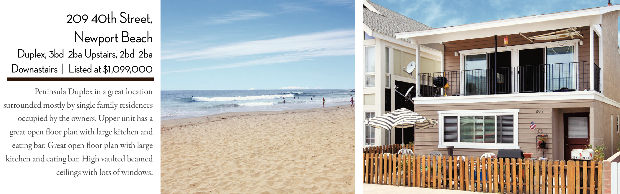 209 40th Street, Newport Beach Duplex, 3bd 2ba Upstairs, 2bd 2ba Downastairs | Listed at $1,099,000 Peninsula Duplex in a great location surrounded mostly by single family residences occupied by the owners. Upper unit has a great open floor plan with large kitchen and eating bar. Great open floor plan with large kitchen and eating bar. High vaulted beamed ceilings with lots of windows.