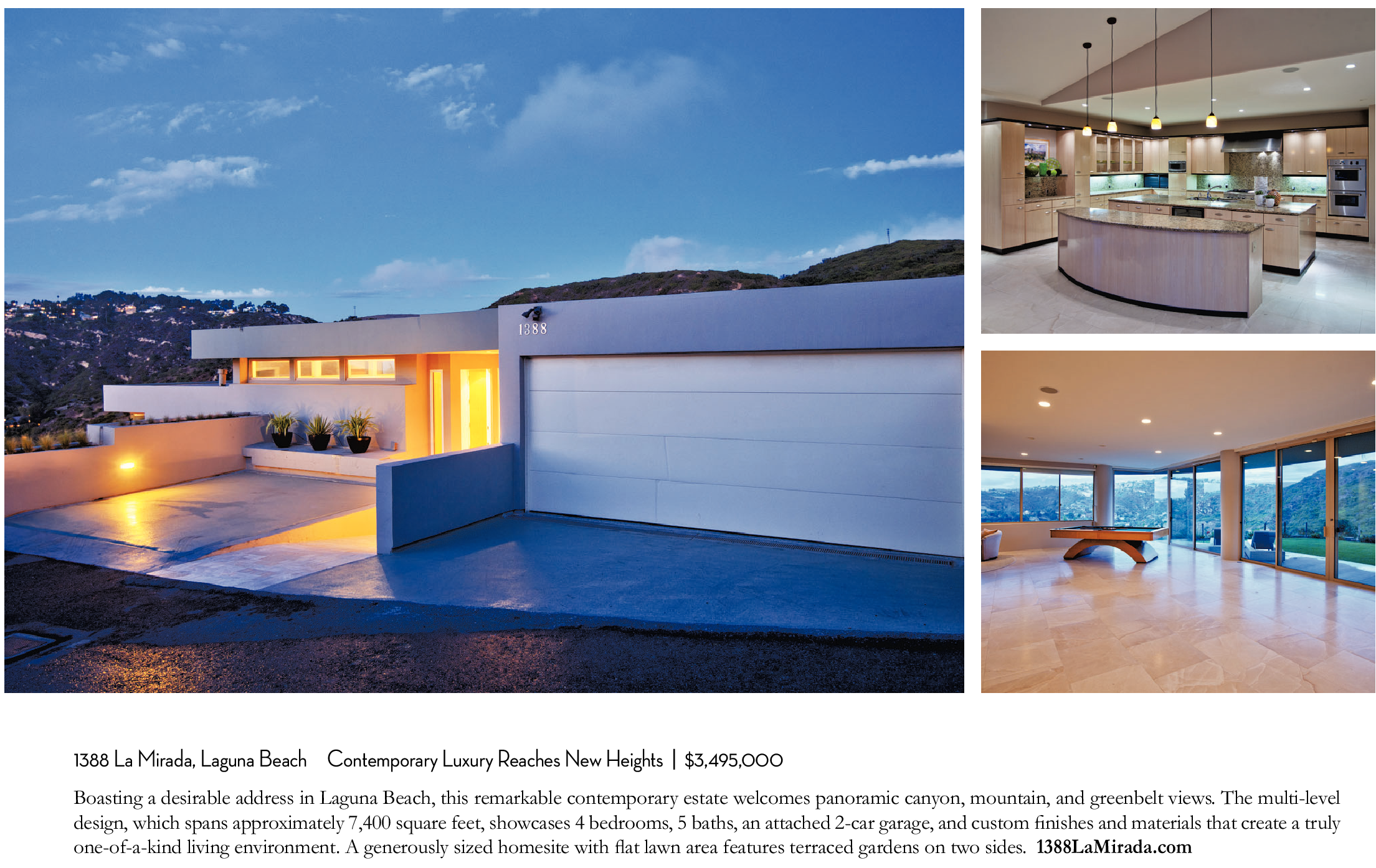 1388 La Mirada, Laguna Beach Contemporary Luxury Reaches New Heights | $3,495,000 Boasting a desirable address in Laguna Beach, this remarkable contemporary estate welcomes panoramic canyon, mountain, and greenbelt views. The multi-level design, which spans approximately 7,400 square feet, showcases 4 bedrooms, 5 baths, an attached 2-car garage, and custom finishes and materials that create a truly one-of-a-kind living environment. A generously sized homesite with flat lawn area features terraced gardens on two sides. 1388LaMirada.com
